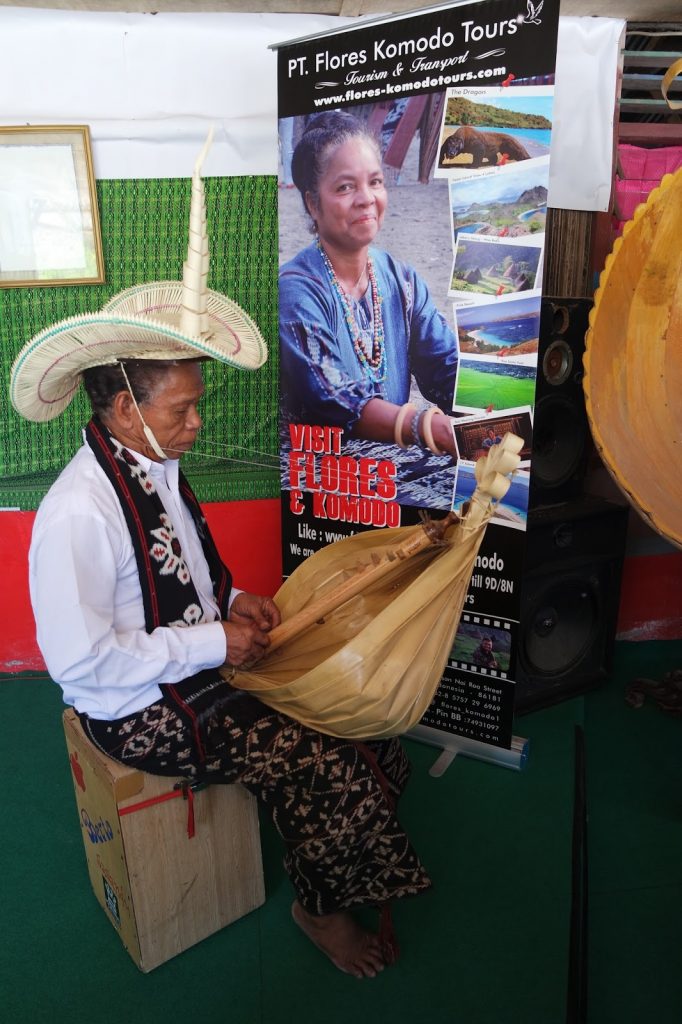 Sebagai pembuka, Si bapak memainkan sasando model lama (tradisional) yang ada pengikat di ujungnya lalu dikalungkan ke leher lalu sasandonya diletakkan di pangkuannya. Sasando sendiri terdiri dari sebuah tabung bambu di tengahnya dimana di sana lah disematkan senar senarnya. Lalu yang bentuknya kayak setengah bola itu adalah daun lontar yang bisa dibuka tutup loh, fungsinya buat resonansi sasandonya.
