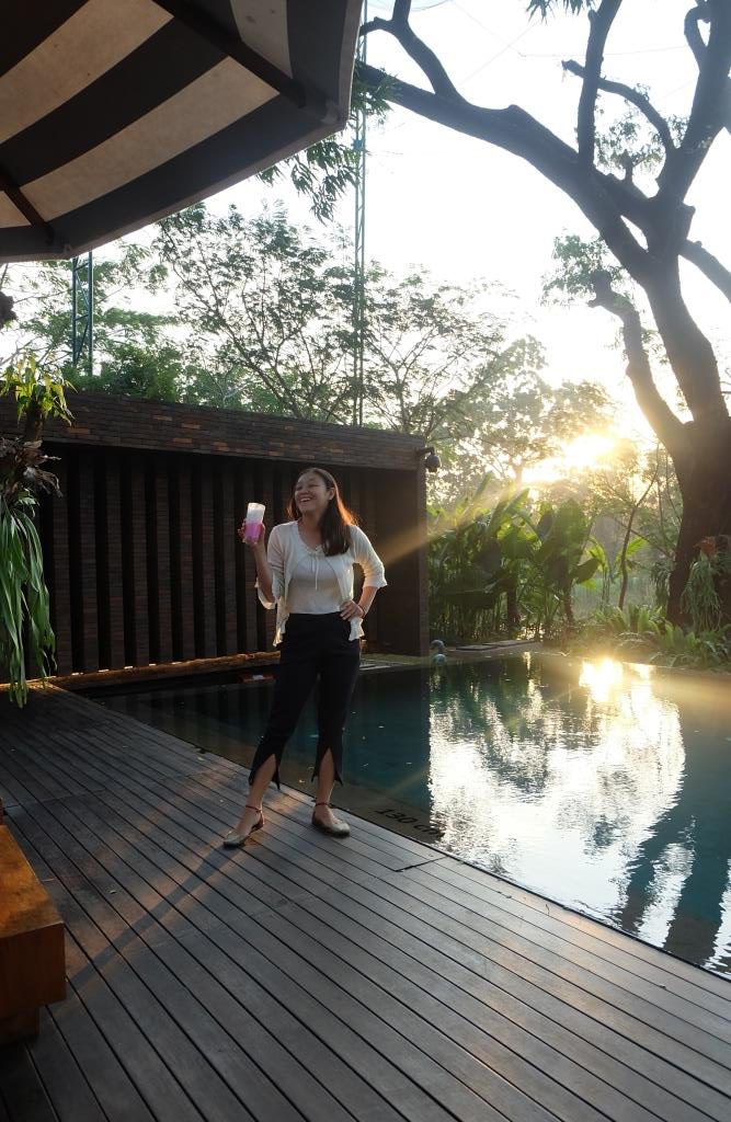 Lagian aku sudah terlanjur nyaman dan merasa adem di pool. Kalau tiba-tiba pindah ke area resto dan suasananya jadi meriah, rasanya batinku ingin berujar “Mau leyeh-leyeh aja di samping pool aaah.”