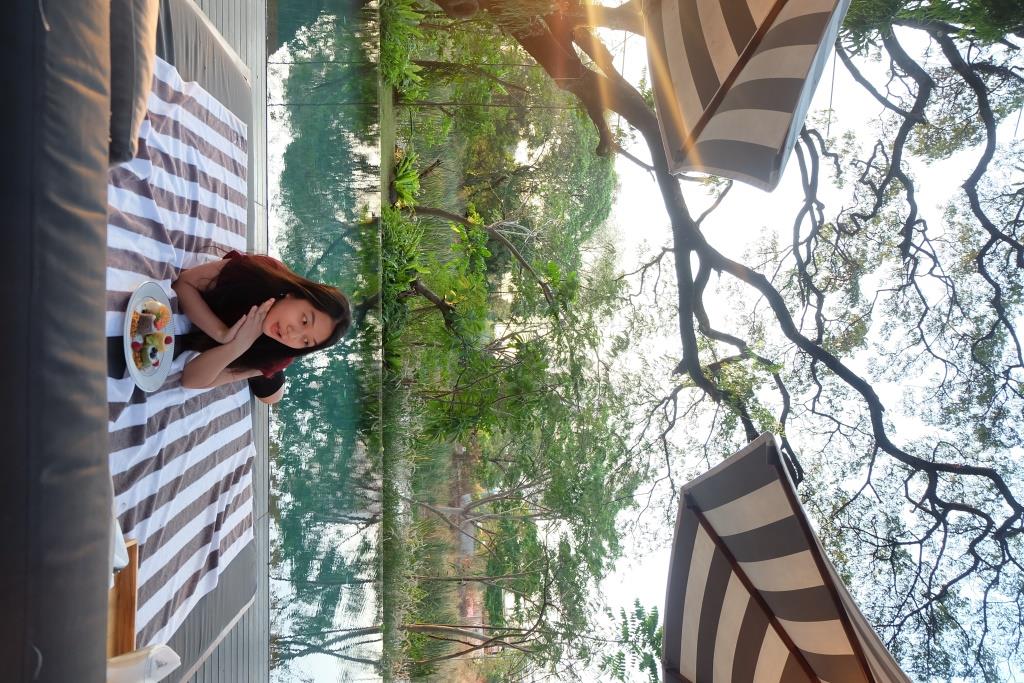 Kelebihan : Next time mungkin aku sekalian coba berenang kali yah. Di informasinya sih bisa mulai dari jam 10 pagi sampai 10 malem. Udah dapet handuk juga. Cuma khusus anak-anak diawasi yah karena endak ada kolam kecil. Sejauh ini baru nemu resto yang ada sun bed dengan view hijau kayak gini persis di belantara hutan beton Jakarta. Definetely aku ke sini karena mau pengalaman ala summer vibes Bali. Plus bisa cuddle-an pula sama pacar… kalau nanti punya. T.T