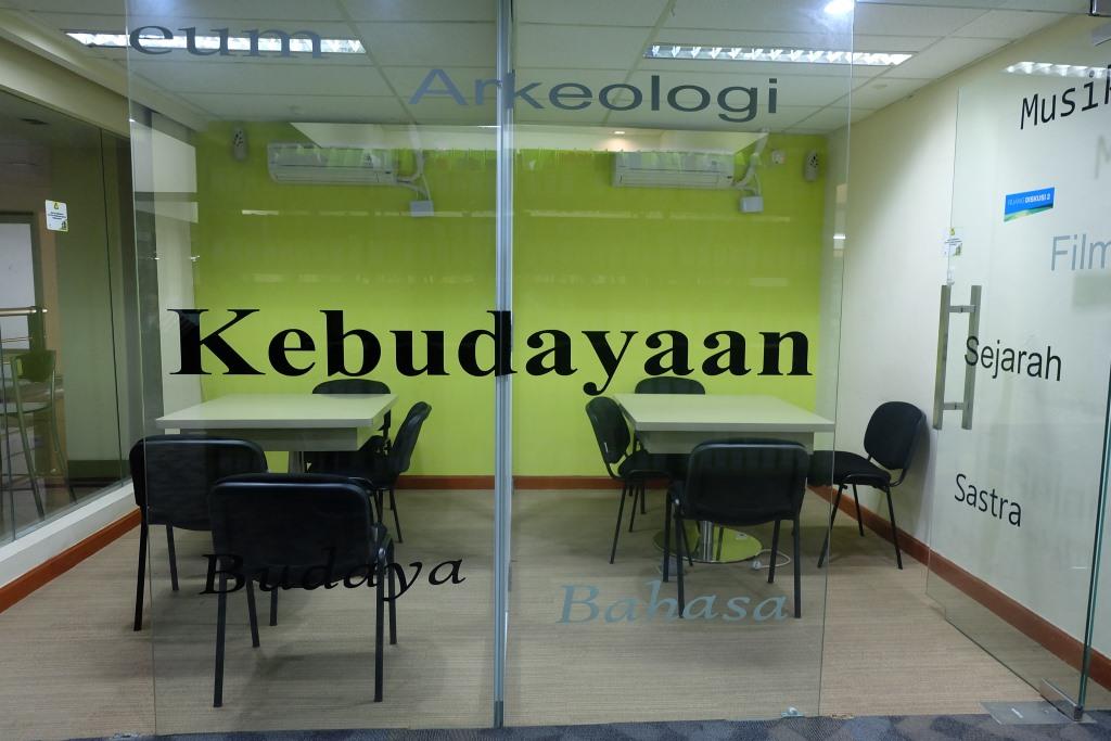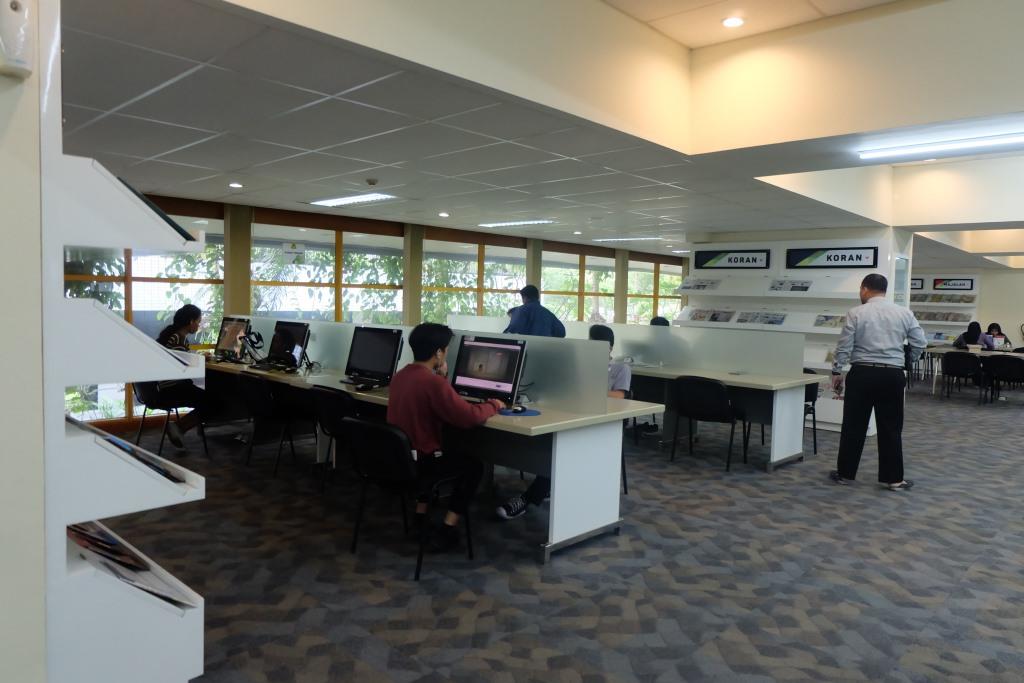 Lokasi perpus ada di lantai 2 kebanyakan. Di lantai 1 itu paling toilet, loker sama rak majalah dan koran. Kalau di lantai 2 lengkap deh, termasuk koleksi buku-buku sih kebanyakan Bahasa Indonesia lah. Yang bikin surprise di sini ada koleksi film dan audio yang lumayan lengkap, rata-rata film asing berbahasa Inggris. Mulai dari topik berat macam sejarah hingga kartun pun ada. Formatnya kebanyakan DVD tapi ada juga yang formatnya kaset jadul gitu. Sempat aku mau puter tapi playernya agak rusak. Yha 🙁