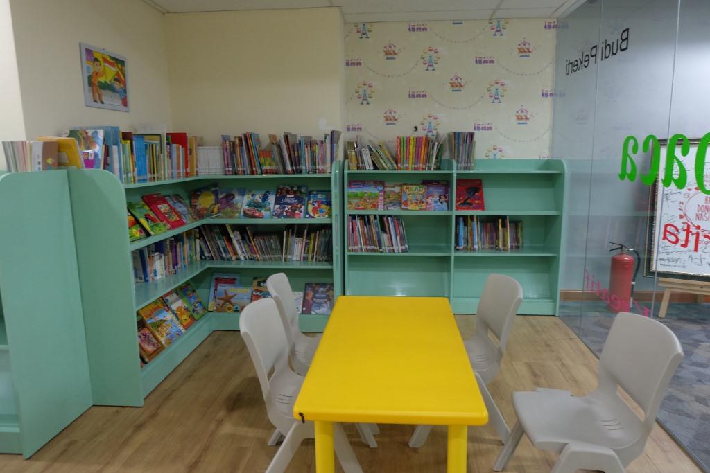 Terus di sini lumayan luas buat yang mau kerja atau bikin PR. Ada meja dengan colokan, ada juga kursi sofa empuk biasa yang bikin ngantuk sambil baca-baca novel gitu.