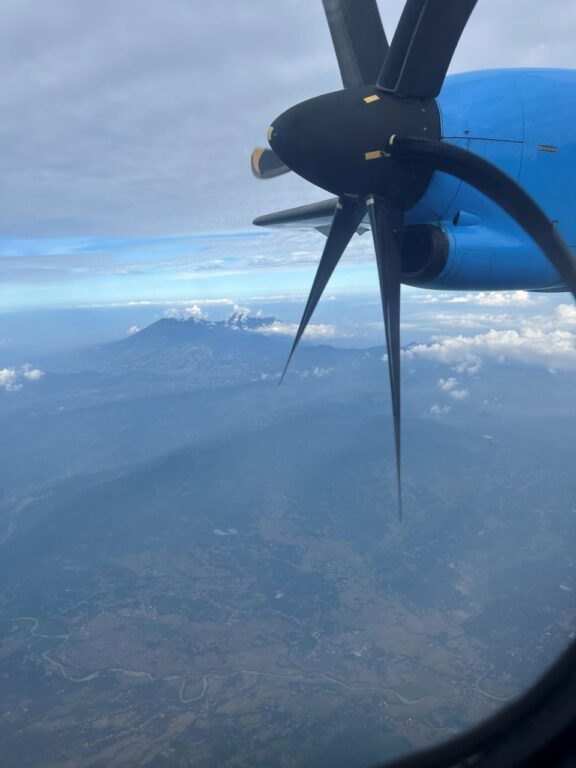 Pesawatnya bersih, lega kok kayak pesawat pada umumnya cuma lebih pendek aja jarak antara kepala dan headbin. Tapi kalau gak diperhatiin yah gak keliatan banget. WC cuma satu di belakang. Lebih mungil tapi bersih juga. Karena flight 1,5 jam, tidak dapat makan minum yah. Pramugarinya juga ga da jualan, jadi aku fokus liat pemandangan aja karena jarang banget kan lewat rute ini lagi. Berhubung pesawat kecil, sepertinya tidak bisa terbang tinggi banget. Bagus juga jadi aku bisa liatin gunung-gemunung yang terlihat jelas. Meski gak tahu itu apa, di mana dll tapi melihat lanskap bumi yang berubah-ubah sangat ampuh untuk membuat jiwaku tentram.