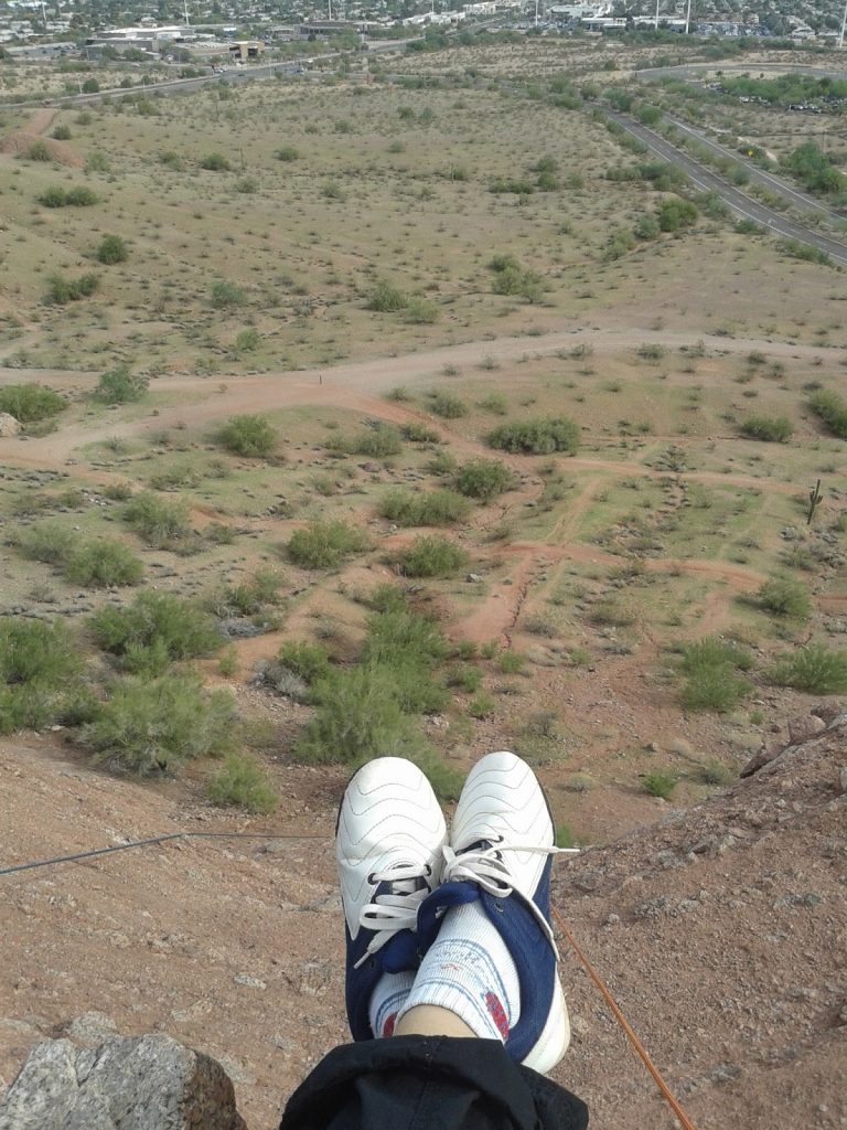 Setibanya di atas bukit, cuaca yang tadinya dingin jadi adem karena keringatan. Duduk dulu lah menikmati pemandangan. Dari bukit, saya bisa lihat banyak orang yang jogging ataupun asik mountain bike di Papago Park ini. Tapi yang lagi rappelling cuma kami seorang. Dari sini keliatan orang orang dan kota jadi mungil kayak di permainan monopoli deh.
