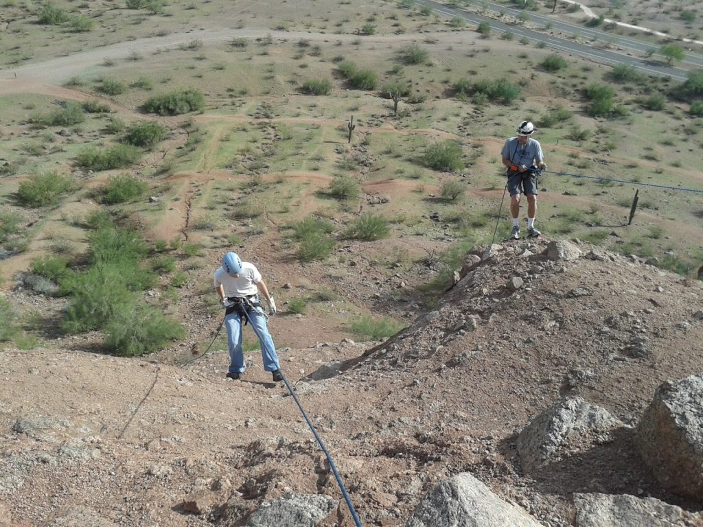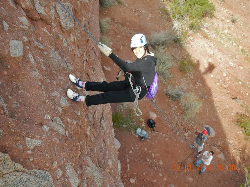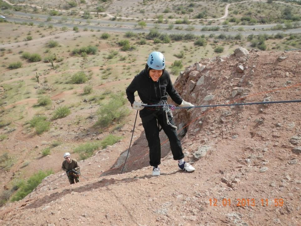 Terinspirasi dari banyaknya nonton The Amazing Race, saya jadi kepengen nyoba aktivitas aktivitas yang agak ekstrem. Kalau bungee jump atau sky dive pastinya ogah. Gak kuat di mental dan kantong! Jadi begitu tawaran rapelling datang, tentu saja tak mungkin saya tolak. Rappelling adalah kegiatan outdoor mirip climbing. Bedanya kita bukannya naik tapi malah turun dengan bantuan tali. Untuk pengalaman pertama ini, saya mencoba di Papoga Park, Arizona. Katanya, di sini spotnya juga dipake buat latihan para pemadam kebakaran. Jadinya di atas bukit yang dituju, sudah ada semacam cantolan buat tali yang telah tersedia. Untuk perlengkapan, kami membawanya sendiri. Berangkat dari apartemen jam 10, kami tiba 20 menit di tepi jalan menuju Papoga Park. Sambil nenteng nenteng backpack, kami berjalan menuju bukit yang akan ditaklukkan. Setelahnya jalanan makin curam dan kami harus mendaki. Haduh terus terang napas saya putus putus *lemah*