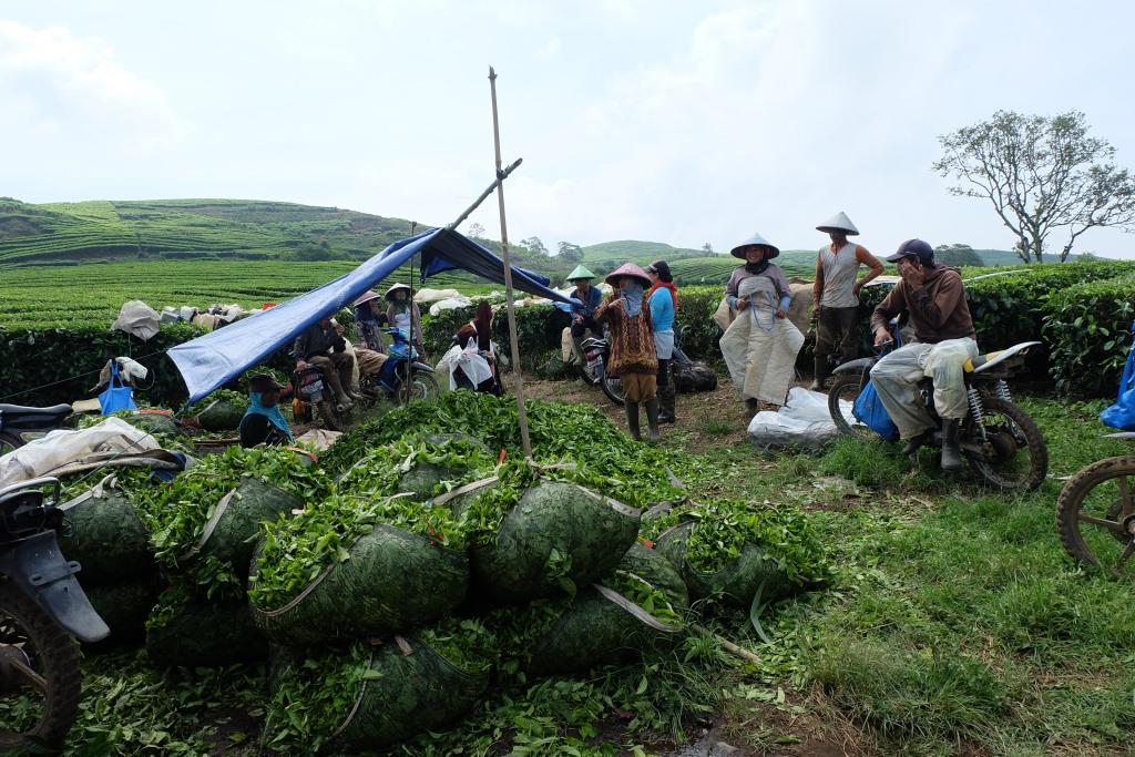 Meski sudah banyak pakai mesin untuk memngambil pucuk teh, tapi tenaga para pemetik ini masih digunakan terutama untuk menggunting bagian-bagian teh yang tidak terkena mesin. Dalam sehari mereka ditargetkan untuk mengumpulkan 60kg teh jika ingin mendapat bonus. Biasanya hampir semua dapat menyelesaikan target ini. Dari pagi-pagi hingga sore biasanya mereka sudah berjibaku dengan tubuh yang dilapisi plastik agar tidak basah ketika terkena embun, serta sepatu boot dan alat penggunting teh yang dimodifikasi sesuai kebutuhan mereka. Setelah hasil petikan dari para pemetik teh ini ditimbang, berkarung-karung teh ini pun diangkut ke truk dan masuk dalam pabrik.