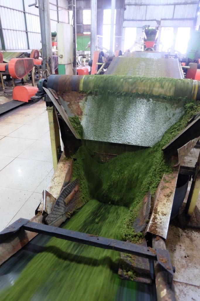 Mesin ini kayak goyang-goyang gitu loh jadi yang ranting, daun busuk jadi jatuh ke bawah dan gak masuk ke dalam mesin penggilingan. Proses seleksi biar hanya pucuk daun terbaik yang lewat ini sampai dua kali jadi tenang saja sudah pasti bersih.